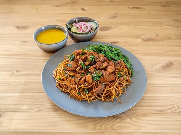 Kipfilet in pikant soja saus, aardappelen en kouseband